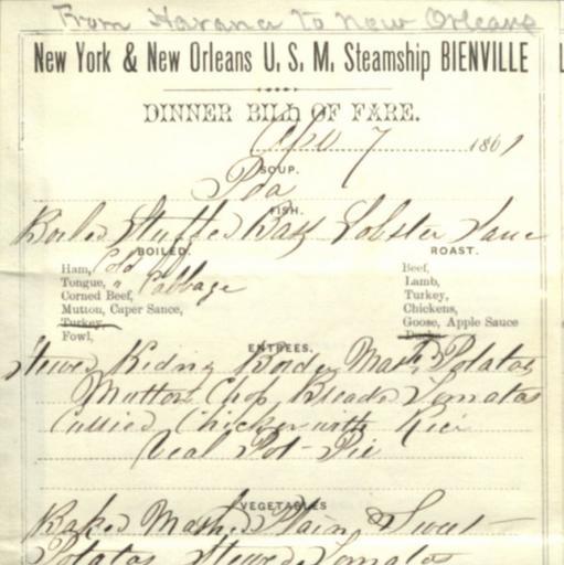 | Keywords: Steamship Bienville on-board restaurant menu (April 7, 1861).jpg en Menus from hotels restaurants and steamboats in the 1850s and 60s http //digital lib uh edu/u /p15195coll34 133 Hospitality Industry Archives 1861-04-07 This image is in the public domain and may be used freely If publishing in print electronically or on a website please use the citation Courtesy of Special Collections University of Houston Libraries To order a higher resolution reproduction see http //info lib uh edu/about/campus-libraries-collections/special-collections-archives/request-digital University of Houston Libraries PD-Old Transcription From Havana to New Orleans<br> New York New Orleans U S M Steamship BIENVILLE<br> DINNER BILL OF FARE<br> Apr 7 1861<br><br> Soup Pea<br> Fish Boiled stuffed Bass Lobster Sauce<br> Boiled Ham Cold; Tongue Cold; Corned Beef Cabbage; Mutton Caper Sauce; Turkey; Fowl<br> Roast Beef Lamb Turkey Chickens Goose Apple Sauce; Ducks<br> <br> Entrees<br> Stewed Kidneys Bed of Mash Potatos<br> Mutton Chop Breaded Tomatos Curried Chicken with Rice; Veal Pot-Pie<br> <br> Vegetables<br> Baked Mashed; Plain Sweet Potatoes Stewed Tomatos <br> 1861 in New Orleans Food menus FAL |