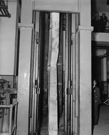 | Keywords: Steel bending U.S. Bureau of Standards.jpg Photograph en Steel bending Washington D C Sept 23 Photo shows the welded steel knees in the 600 000 lb testing machine at the U S Bureau of Standards today as it buckled under 153 600 lb maximum load This rigid steel frame knee was designed to withstand 60 000 lbs 9/23/37 Harris Ewing photographer 1937 September 23 1 negative glass 4 x 5 in or smaller LOC-image hec 23412 accession number LC-DIG-hec-23412 digital file from original negative Call Number LC-H22- D-2405 P P Rights Advisory No known restrictions on publication Title from unverified caption data received with the Harris Ewing Collection Gift; Harris Ewing Inc 1955 General information about the Harris Ewing Collection is available at http //hdl loc gov/loc pnp/pp hec Temp note Batch five steel bending us bureau of standards tif yes PD-Harris-Ewing National Bureau of Standards 1937 in Washington D C |