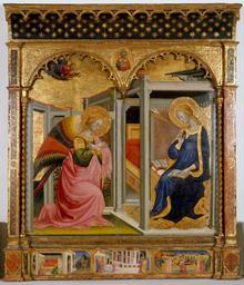 | Keywords: Stefano d'Antonio di Vanni - The Annunciation - Google Art Project.jpg non-free frame 1405 1483 Stefano 27695395 d'Antonio di Vanni Italian 1405 - 1483 /collection/the-walters-art-museum/artwork/the-annunciation-stefano-dantonio-di-vanni/27783216/ 36492 Stefano d'Antonio di Vanni Artist /artist/stefano-dantonio-di-vanni/27864004/ 27864004 /collection/the-walters-art-museum/ The Walters Art Museum 27751297 http //thewalters org/ /collection/the-walters-art-museum/artwork/the-annunciation-stefano-dantonio-di-vanni/27783216/ 1418 ca 1430 Renaissance tempera and gold leaf on panel Stefano Bardini Collection prior to 1890 mode of acquisition unknown cited in Fiorenza Scalia La citta degli Uffizi-Florence 1982 p 46 with 1890 photo of Bardini Gallery showing this painting; Lawrence W Hodson Wolverhampton Compton Hall England date and mode of acquisition unknown; Sale Christie's London June 25 1906 no 187 as early Italian school; C Fairfax-Murray London and Florence 1907 mode of acquisition unknown; Henry Walters Baltimore 1913 by purchase Bernard Berenson as agent; Walters Art Museum 1931 by bequest 164 4 27783216 False 1442 /collection/the-walters-art-museum/level/charles-street-third-floor/27821728/ Charles Street Third Floor 37 448 http //art thewalters org/detail/36492 The Walters Art Museum Acquired by Henry Walters 1913 altarpieces; paintings 1410 1450 Florence Italy Place of Origin w144 x h164 x d25 cm ca 1430 Renaissance False 0 859375 http //creativecommons org/licenses/by-nc-sa/3 0/ Object /collection/the-walters-art-museum/level/charles-street-third-floor/27821728/13th-15th-century-italian-art/27748228/ 13th-15th Century Italian Art the-annunciation-stefano-dantonio-di-vanni The Annunciation a 144 7 Transcription In the halo of the archangel counter-clockwise AVE MARIA GRATIA PLENA DNS TECV; Transcription In the halo of the Virgin clockwise ECCE ANCILLA DOMINI FIAT M M ; Transcription On the book lying near the door FEMIA / CIRCI / DABIT / VIRVM / IEREM / IA PHA / 31; Transcription On the book held by the Virgin ECCE VIR / GO CONC / IPIET ; Transcription Across the base of the main panel on the frame dividing it from the predella O BENE FECVNDA VIRGINITAS QVE NOVO INAVDITOQUE GENERE ET MATER DICI POSSIT ET VIRGO tempera and gold leaf on panel Stefano Bardini Collection prior to 1890 mode of acquisition unknown cited in Fiorenza Scalia La citta degli Uffizi-Florence 1982 p 46 with 1890 photo of Bardini Gallery showing this painting; Lawrence W Hodson Wolverhampton Compton Hall England date and mode of acquisition unknown; Sale Christie's London June 25 1906 no 187 as early Italian school; C Fairfax-Murray London and Florence 1907 mode of acquisition unknown; Henry Walters Baltimore 1913 by purchase Bernard Berenson as agent; Walters Art Museum 1931 by bequest special url_id -wGSQda01U2QWw PD-old-100-1923 1483 Google Art Project works by Stefano d'Antonio di Vanni Stefano d'Antonio di Vanni Paintings of Annunciation in Italy Ecce Virgo |