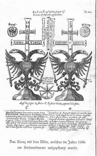 | Keywords: Stefansturm.jpg en Engraving of cross and eagle installed on the tower of Saint Stephen Vienna in 1686 after the siege of Vienna 1683 de Stich von Kreuz und Adler aufgerichtet auf dem Turm des Stefansdoms in Wien im Jahre 1686 nach der Türkenbelagerung 1683 Own Wolfgang Sauber 12 09 2008 PD-old-100 Battle of Vienna 1686 Exterior of St Stephen's Cathedral Vienna Eagles in art Double-headed eagles 17th-century engravings | ||||
