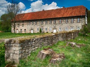 Keywords: steinheim germany warehouse building architecture grass wall stone sky clouds hdr