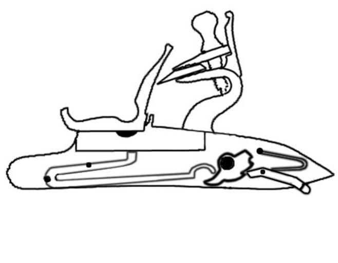 Keywords: Steinschlossladerast.jpg en Flintlock mechanism cross section Gun loaded Cock in safe position<br>de Innenansicht Schloss ist in Laderast/Sicherheitsrast Der Abzug kann jetzt nicht betätigt werden <br> pl Zamek skałkowy Kurek w pozycji zabezpieczonej broń załadowana Werner Hanauska Source German Wiki badJPG Flintlock mechanisms |