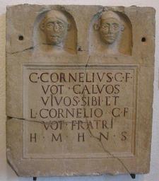 Keywords: Stelecornelius1.jpg Stele antico-romana di due fratelli della Gens Cornelia nell'ex Museo Archeologico di Bergamo CIL V 5154 Foto di Giorces 2006-07-05 own assumed Giorces Gens Cornelia CIL V 005154 Ancient Roman reliefs in the Museo archeologico Bergamo Ancient Roman gravestones in Bergamo Ancient Roman inscriptions in Bergamo Ancient Roman steles in Italy Bergamo Brothers in art |