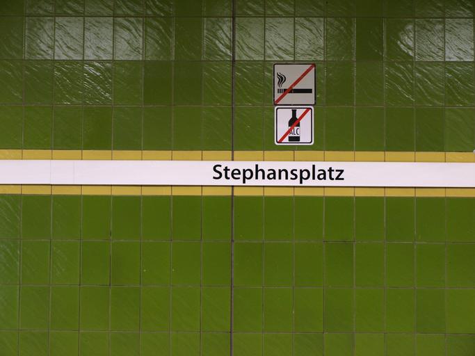 Keywords: stephansplatz subway station stop station metro underground architecture wall green hamburg shield tiles non smoking no alcohol subway hochbahn city light lighting