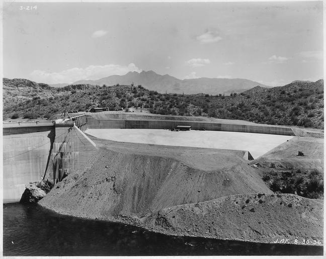 | Keywords: "Stewart Mountain Dam. View from left abutment showing completed spillway channel." - NARA - 294639.tif Scope and content Photograph from Volume One of a series of photo albums documenting the construction of Roosevelt Dam Stewart Dam and other related work on the Salt River Project in Arizona General notes 294639 Local identifier Department of the Interior Bureau of Reclamation Engineering and Research Center 05/18/1981 - 03/04/1988 NARA's Rocky Mountain Region Denver NRGA Building 48 Denver Federal Center West 6th Avenue and Kipling Street Denver CO 80225-0307 1936-08-30 Record group Record Group 115 Records of the Bureau of Reclamation 1889 - 2008 Record group ARC 444 Photograph albums compiled 1903 - 1972 Series ARC 293611 File unit File unit ARC Variant control numbers NAIL Control Number NRG-115-CONSTPHO85006-SALTRIVERS213 yes Other versions <gallery> File Stewart_Mountain_Dam _View_from_left_abutment_showing_completed_spillway_channel _-_NARA_-_294639 tif tif File Stewart_Mountain_Dam _View_from_left_abutment_showing_completed_spillway_channel _-_NARA_-_294639 jpg jpg </gallery> NARA-cooperation PD-USGov Stewart Mountain Dam NARA TIF images with categorized JPGs |