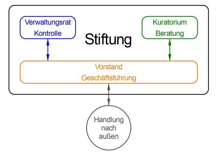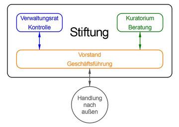 | Keywords: Stiftungsorgane.png  de Beispiel für eine Stiftung mit drei Stiftungsorganen Ein Vorstand orange führt die Geschäfte und vertritt die Stiftung nach außen und nach innen ein Verwaltungsrat blau kontrolliert den Vorstand und ein Kuratorium grün berät den Vorstand own Membeth 2016-07-18 Foundations organizations Cc-zero |