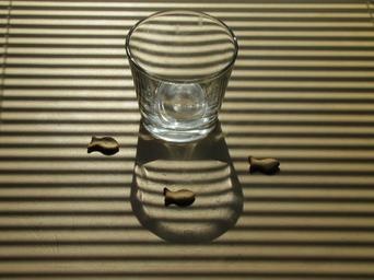 Keywords: still life fish glass of water cookies water strips jalousie shadow