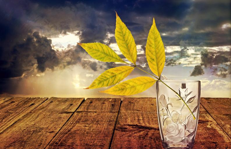 Keywords: still life glass vase decoration deco flower vase leaves true leaves still arrangement decorative wood planks view distant wood floor sky clouds lichtspiel lighting cloud formation free art dream romantic ray of hope confidence hope