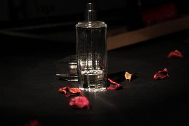 Keywords: still life photography glass dark rose petal perfume