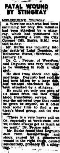 Keywords: Stingray attack 1953.jpg en from the http //www nla gov au/ndp/ National Library Australian newspapers digitisation program which are pre-1955 so no copyright The service includes newspapers published in each state and territory from the 1800s to the mid-1950s when copyright applies http //nla gov au/nla news-article2884972 Canberra Times 1953-06-26 PD-Australia Dasyatidae National Library of Australia - Australian Newspapers Service |