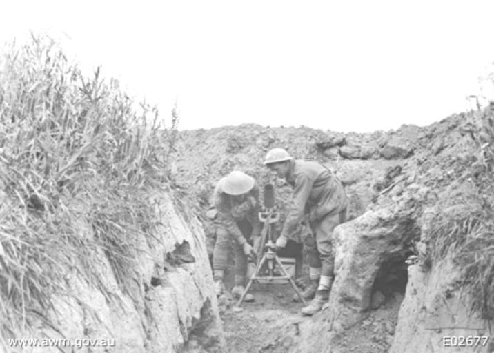 Keywords: StokesMortar7thAustralianLightTrenchMortarBattery10July1918.jpeg Two men of the 7th Australian Light Trench Mortar Battery operate a light trench mortar established in a machine gun post on the new front line <p>From left to right http //deepthought hass adfa edu au 8080/showPerson pid 90765 1916 Lance Corporal A J Ellis and http //deepthought hass adfa edu au 8080/showPerson pid 171659 2700 Private A Lawler <p>This position was part of a few hundred yards captured from the enemy in a silent daylight raid the day previously by a party of the 27th Battalion The location is just east of Villers-Bretonneux between the railway and the south side of the Amiens-St Quentin main road alongside a position called 'The Orchard' <br>Comment 7th Light Trench Mortar Battery served with 7th Infantry Brigade in 2nd Division <br>Place made France Picardie Somme Villers-Bretonneux <br>Comment The mortar is a 3 inch Stokes Mortar <br>NOTE This version of the photograph has brightness and contrast artificially increased to highlight details E02677 1918-07-10 Maker Unknown Copyright clear PD-AustraliaGov 3 inch Stokes Mortar World War I forces of Australia in France Villers-Bretonneux World War I trench warfare in France Villers-Bretonneux Black and white photographs Villers-Bretonneux