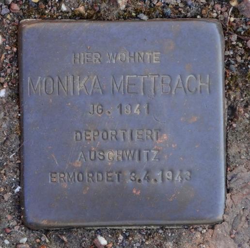 | Keywords: Stolperstein Ulmenweg 16, Siebleben.JPG de Stolperstein Ulmenweg 16 Siebleben Gotha 2015-02-22 11 31 39 own Aschroet other versions other fields 1 inscription inscription HIER WOHNTE<br /><big>MONIKA METTBACH</big><br />JG 1941<br />DEPORTIERT<br />AUSCHWITZ<br />ERMORDET 3 4 1943 de 50 946146388889 10 742258055556 heading 52 5 cc-zero Uploaded with UploadWizard Stolpersteine in Gotha Siebleben | ||||