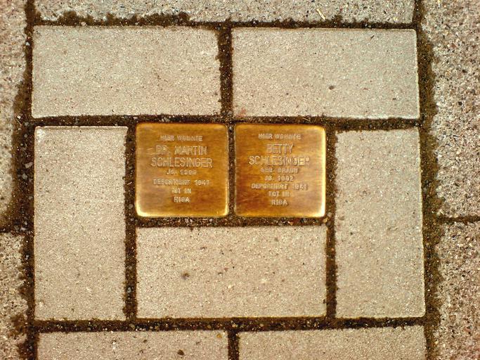 Keywords: Stolpersteine Hanover Villa Simon Dr. Martin Schlesinger Betty Braun 1941 Riga.jpg Stolpersteine to commemorate the Jews Dr jur Martin Schlesinger Juny 28 1900 in Kattowitz; declared as to December 31 1945 in Riga and his wife Betty Schlesinger born Braun August 3 1902 in Ostrowo; declared as to December 31 1945 in Riga in Hanover in front of the Villa Simon at the Königsworther Platz Konigsworther Square in the Brühlstrasse 27 formerly No 7 After the so called Reichskristallnacht the couple Schlesinger retrieved their two children at that time the nine years old Michal and his 6 years old sister from a worser destiny Without the forbidden good-bye at the station the parents sent their children by one of the last Kindertransporte on August 22 1939 to Liverpool But the parents had been declared 1941 as stateless according to § 2 der 11 Verordnung zum Reichsbürgergesetz vom 25 11 1941 Reichsgesetzblatt 1 Seite 722 and deported to the lettish Riga The local Riga Ghetto had been cleared after the assassination of thousands of lettish Jews for work input of Jews from Germany Since the end of 1943 the ghetto had been liquidated the survivers brought step by step to the Kaiserwald concentration camp How and when the couple Schlesinger died could never be clarified After the request of their children who in England adopted the birth name of her mother Braun and anglicized it into Brown the Amtsgericht Hannover declared their parents as dead on March 29 1952 backdated to December 31 1945 24 o'clock Not before 2009 the already 79 years old son Michael could commemorate his parents in presence with Dr Peter Schulze and Gabriele and Frank Lehmberg of the Deutsch-Israelische Gesellschaft - instead of the not existent graves now there where Gunter Demnig placed the Stolpersteine in front of the last common home of the former family Schlesinger Stolpersteine zum Gedenken an die Juden Dr jur Martin Schlesinger 28 Juni 1900 in Kattowitz; als erklärt zum 31 Dezember 1945 in Riga und seine Frau Betty Schlesinger geborene Braun 3 August 1902 im damaligen Ostrowo; als erklärt zum 31 Dezember 1945 in Riga in Hannover vor der Villa Simon am Königsworther Platz Brühlstraße 27 damalige Hausnummer 7 Nach der sogenannten Reichskristallnacht rettete das Ehepaar Schlesinger ihre beiden Kinder den damals 9jährigen Michael und seine 6 Jahre alte Schwester vor schlimmeren Schicksal Ohne - den verbotenen - Abschied am Bahnhof sandten die Eltern ihre Kinder mit einem der letzten Kindertransporte am 22 August 1939 ins britische Liverpool Die Eltern aber wurden 1941 als staatenlos erklärt gemäß § 2 der 11 Verordnung zum Reichsbürgergesetz vom 25 11 1941 Reichsgesetzblatt 1 Seite 722 und ins lettische Riga deportiert Das dortige Ghetto Riga war durch die Ermordung tausender lettischer Juden 1941 freigemacht worden für Arbeitseinsätze von Juden aus Deutschland Das Ghetto wurde 1943 aufgelöst die à berlebenden schrittweise in das Konzentrationslager Riga-Kaiserwald verbracht Wie und wann das Ehepaar Schlesinger starb konnte nie geklärt werden Auf Antrag ihrer Kinder die in England den Geburtsnamen der Mutter Braun angenommen und anglisiert hatten Brown erklärte das Amtsgericht Hannover am 29 März 1952 die Eltern rückwirkend zum 31 Dezember 1945 24 Uhr für tot Erst 2009 konnte der schon 79jährige Sohn Michael seinen Eltern im Beisein von Dr Peter Schulze und Gabriele und Frank Lehmberg von der Deutsch-Israelischen Gesellschaft gedenken - anstelle der nicht vorhandenen Gräber nun vor den von Gunter Demnig verlegten Stolpersteinen am letzten gemeinsamen Wohnort der Familie Stolpersteine à commémorer aux juifs Dr jur Martin Schlesinger né le 28 juin 1900 à Kattowitz; déclaré mort au 31 decembre 1945 à Riga et sa femme Betty Schlesinger née Braun née le 3 august 1902 à d'antan Ostrowo; déclarée au 31 dezember 1945 à Riga Après la dite Nuit de Cristal le couple Schlesinger a sauvé leurs deux enfants leur d'antan fils Michael de 9 ans et sa soeur de 6 ans d'un destin plus gravé Sans les - interdites - adieux à la gare les parents ont envoyés leur enfants à Liverpool le 22 august 1939 avec un des derniers Kindertransporte Mais les parents etait déclarés 1941 comme sans nationalité selon § 2 der 11 Verordnung zum Reichsbürgergesetz vom 25 11 1941 Reichsgesetzblatt 1 Seite 722 et déportés à Riga latvienne Le Ghetto Riga là -bas était déchargé par le meutre des milliers juifs latviens pour la mobilisation pour le travail par le juifs d'Allemagne Le ghetto etait annulé en 1943 les survivants étaient mis pied à pied au camp de concentration Riga-Kaiserwald Comment et quand le couple disparu - c'etait jamais éclairé D' après la demande de leurs enfants qui ont adaptés à la Britannie le nom de leur mère Braun et anglicisés Brown le tribunal d'instance Amtsgericht Hannover a déclaré le 29 mars 1952 les parents d'etre mort avec effet rétroactif au 31 decembre 1945 Seulement en 2009 le fils Michael qui etait a ce temps déjà 79 ans accompagné par Dr Peter Schulze et Gabriele et Frank Lehmberg de la societé Deutsch-Israelische Gesellschaft pourrait commémorer ses parents - au lieu des tombes pas existantes mais maintenant devant les Stolpersteine posé par Gunter Demnig à la place du dernier domicile da la famille Schlesinger Photo own ; Stolpersteine Gunter Demnig Bernd Schwabe in Hannover 2010-03-17 Stolpersteine in Hannover Brühlstraße Hannover Königsworther Platz 1941 in Hannover Villa Simon Hannover |