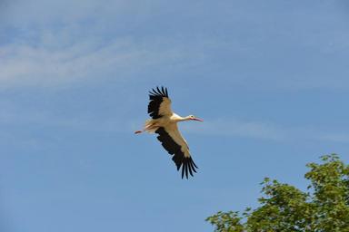 Keywords: stork bird animals rattle stork nature white stork fly sky stork village blue summer nest landing roof idyllic tree leaves crown