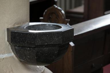 Keywords: stoup holy water pool container water basin pew bank church stone wood christian