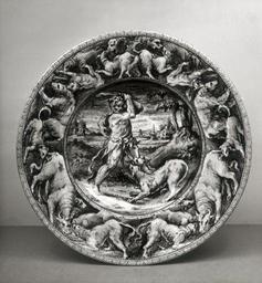 | Keywords: Stradanus - Dish with Hercules Overcoming Cerberus - Walters 481330.jpg  Hercules captured Cerberus the vicious three-headed dog who guards the entrance to the underworld as the last of his twelve Labors Stradanus arrived in Florence in 1546 and for much of his career worked on commissions for various members of the Medici family principally as a painter He also produced a large number of drawings with hunting scenes for tapestries and for engravings as well as a small number for ceramics Here the fluid expressive style and use of a blue that he employed in his drawings on paper suggest that he drew directly on the dish The initials C D on the back must be those of the master of the workshop where the plate was produced possibly in or near Florence between 1560 1590 Renaissance earthenware with tin glaze maiolica cm 5 3 33 2 accession number 48 1330 11508 H Wencke Collection Hamburg date and mode of acquisition unknown Henry Walters city Baltimore Walters Art Museum Henry Walters Acquired by Henry Walters 1908 initials place of origin Florence Italy Walters Art Museum license Italian Renaissance maiolica in the Walters Art Museum Jan van der Straet Media contributed by the Walters Art Museum needs category review Florence maiolica Capture of Cerberus |