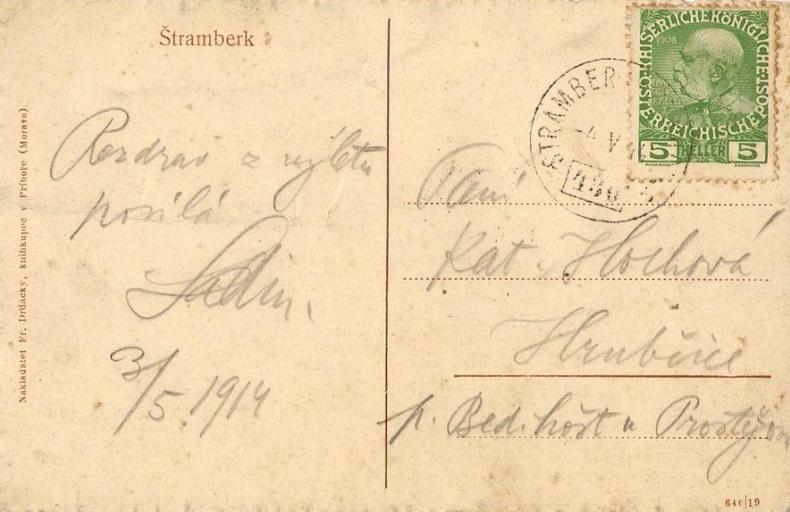 | Keywords: Štramberk, pohlednice 1914 01b.jpg Štramberk pohlednice odeslaná roku 1914 http //aukro cz/item1321479626_stramberk_novy_jicin_hrad_mesto_1914 html Aukro cz < 1914 Nakladatel Fr Drdácký knihkupec v Příboře Morava PD-old <gallery>File Štramberk pohlednice 1914 01a jpg Other side</gallery> Postcards of Štramberk Postcards of Moravia before 1918 Postmarks of Czech lands before 1918 Stamps on covers and postcards Backs of postcards Postmarks uncategorised by city 1908 Austrian jubilee issue |