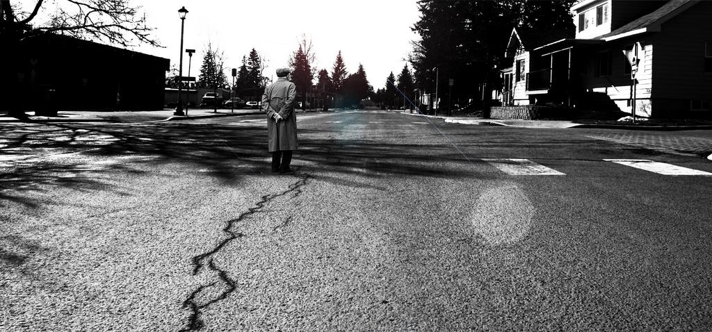 Keywords: street road village town asphalt cracked person male old man lonesome lonely alone standing urban zebra crossing pedestrian black and white
