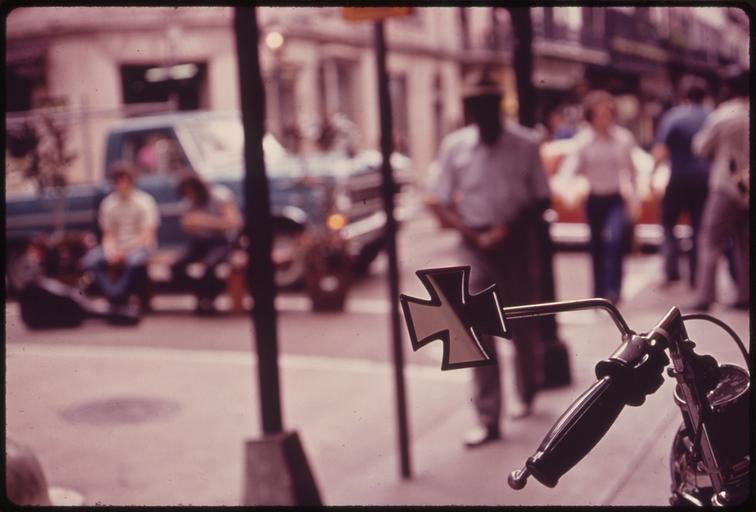 | Keywords: STREET SCENE - NARA - 546169.jpg Scope and content French Quarter New Orleans Louisiana General notes View is from doorway of the A P grocery store at the downtown lake corner of Royal and St Peter Streets French Quarter looking across towards the Pedesclaux-Lemonnier House diagonally across the intersection Only the foreground is in sharp focus showing portion of a motorcycle including a cross shaped mirror parked on the sidewalk Beyond in blurred focus can be seen pedestrians auto traffic heading back on St Peter Street Two people are seated in street at left; one with guitar case; likely they are street musicians 546169 Local identifier 412-DA-3682 Environmental Protection Agency 12/02/1970 - NARA-Author St Gil Marc 1924-1992 Photographer 8464473 <br /> New Orleans Orleans Louisiana United States North and Central America inhabited place 4202431 29 95 -90 067 <br /> Still Picture Records Section Special Media Archives Services Division NWCS-S National Archives at College Park 8601 Adelphi Road College Park MD 20740-6001 05/1972 Record group Record Group 412 Records of the Environmental Protection Agency 1944 - 2006 Record group ARC 708 DOCUMERICA The Environmental Protection Agency's Program to Photographically Document Subjects of Environmental Concern compiled 1972 - 1977 Series ARC 542493 File unit File unit ARC Variant control numbers Agency-Assigned Identifier 062/22/003682<br /> NAIL Control Number NWDNS-412-DA-3682 Other versions <gallery> File STREET_SCENE_-_NARA_-_546169 tif tif File STREET_SCENE_-_NARA_-_546169 jpg jpg </gallery> NARA-cooperation PD-USGov 1972 in New Orleans Royal Street French Quarter DOCUMERICA Pedestrians in the United States May 1972 in the United Kingdom |