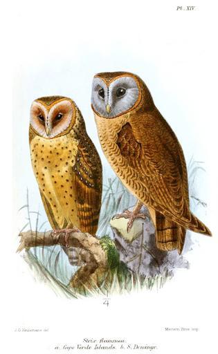 Keywords: StrixFlammeaKeulemans.jpg a left Strix flammea <small> L </small> Cape Verde Islands Tyto alba detorta <small>Hartert 1913</small><br/> b right Strix flammea <small> L </small> S Domingo Tyto glaucops glaucops <small> Kaup 1853 </small> Barn Owl left Ashy-faced Owl right Catalogue of the birds in the British Museum http //www archive org/details/catalogueofbirds02brit Vol 2 Plate XIV 1875 creator John Gerrard Keulemans Richard Bowdler Sharpe text PD-old-100 CBBM02 Tyto alba in art Tyto glaucops |