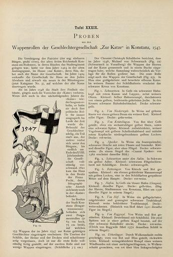 | Keywords: Ströhl Heraldischer Atlas t39 1.jpg Hugo Gerhard Ströhl Heraldischer Atlas Stuttgart 1899 Tafel 39 Proben aus den Wappenrollen der Geschlechtergesellschaft Zur Katze in Konstanz 1547 Text http //austria-forum org/wbg/ heraldischeratl00de1899kfu austria-forum org 1899 Creator Hugo Gerhard Ströhl 1919 Heraldischer Atlas Ströhl Coats of arms from Konstanz |