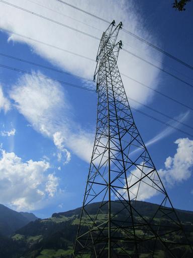 Keywords: strommast electricity energy high voltage power supply current power line pylon sky steel technology landlines voltage line wires reinforce landscape austria zillertal