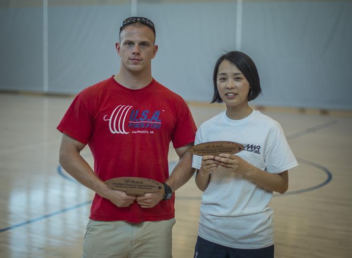 Keywords: Strong arm competition, RIMPAC 2014 140703-N-PX130-069.jpg en Machinist's Mate Fireman Jordan Rank assigned to USS Ronald Reagan CVN 76 and Petty Officer 1st Class Ji Yee La assigned to ROKS Seoae Ryu Seong-ryong DDG 993 pose with their first place awards for the male and female groups of a strong arm competition held during Rim of the Pacific RIMPAC Exercise 2014 The world's largest international maritime exercise RIMPAC provides a unique training opportunity that helps participants foster and sustain the cooperative relationships that are critical to ensuring the safety of sea lanes and security on the world's oceans Twenty-two nations more than 49 ships six submarines more than 200 aircraft and 25 000 personnel are participating in RIMPAC U S Navy photo by Mass Communication Specialist 1st Class Daniel Gay/Released 2014-07-03 Petty Officer 1st Class Daniel Gay https //www dvidshub net/image/1439607 140703-N-PX130-069 2014-07-09 05 34 JOINT BASE PEARL HARBOR-HICKAM HI US PD-USGov-Military-Navy Sports at Pearl Harbor USS Ronald Reagan CVN-76 Seoae Ryu Seong-ryong DDG-993 RIMPAC 2014 Images from DoD uploaded by Fæ |