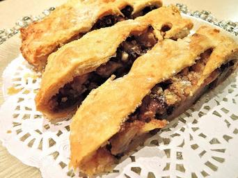 Keywords: strudel slice apple raisins nuts baked sweet food