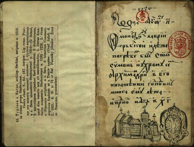 Keywords: Studenica Typicon.jpg sr Дигитална копија комплетног укописа Студеничког типика који је свети Сава написао 1208 г по доласку у С бију на молбу б ата Стефана Свети Сава постаје ста ешина манасти а где активно ади на о ганизацији монашког живота у Студеници Овај ц квени устав тј п авилник о богослужењима и животу монаха у манасти има Сава пише по узо у на Хиланда ски типик Значај Студеничког типика је највише у томе што ће постати главна основа за устав С пске п авославне ц кве Дигитална копија Студеничког типика добијена је љубазношћу ди екто а ационалног музеја у П агу господина ихала Лукеша О игинал се чува у том музеју под сигнату ом IX H 8 Š10 1208 cite web Одг Ста и Рукописи http //www pravoslavna-srbija com/forum/index php topic 1426 12 Original by St Sava 1208 other versions Custom license marker 2015 01 11 PD-old-100 Uploaded with UploadWizard Saint Sava 13th-century works in Serbia Serbian manuscripts Studenica Monastery