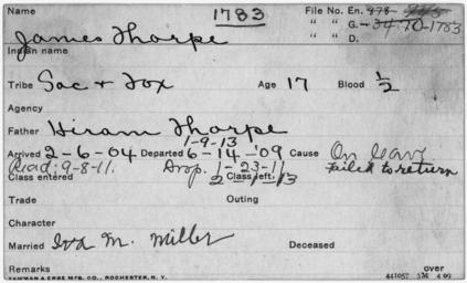 MAKE A MEME View Large Image Student Information Card for Jim Thorpe - NARA - 595341.tif Scope and content The card gives the student name sex tribe dates entered and left school parents names and age at entrance date General notes 595341 Local identifier Department of ...