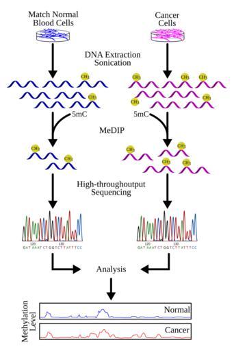 | Keywords: Study-flow.svg en This is a workflow that demonstrates the general strategy in a MeDIP-seq experiment Particularly the example investigates cancer as a general source of disease condition; however the starting source can range from different tissue types or different time points This diagram outlines very briefly the steps in MeDIP-seq including the use of software for aligning short reads depicted at the High-throughput Sequencing step At the anlysis stage a graph can be used to visualize and compare methylation levels between experimental sample i e cancer/disease state tissue-specific time-specific etc and the control i e normal/blood cells baseline time-point normal tissue etc The peaks show in the plot can essentially represent the frequency or short reads that have been aligned to the particular region in the genome The more reads that cover a particular region then the higher the methylation level This can be explained by MeDIP having enriched for methylated DNA at this region The plot and data in this diagram is entirely simulated and does not represent real MeDIP-seq data; this is to simply display typical visualization that can be used during MeDIP-seq analysis Study-flow jpg 50 2013-06-15 17 13 UTC Study-flow jpg Gavinha derivative work Shakiestone svg Study-flow jpg Biochemistry methods Diagrams illustrations and schemas concerning cancer DNA methylation |
