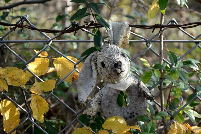 MAKE A MEME View Large Image stuffed animal old forget lost wire mesh fence wire fence fence security barrier symbol demarcation fenced leaves plant autumn imprisoned