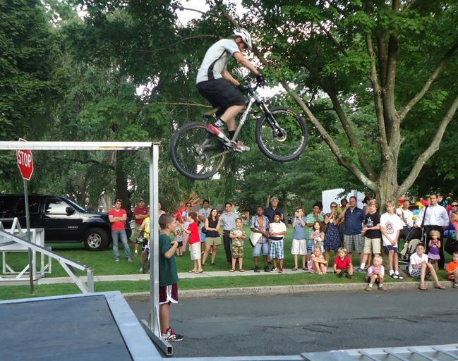Keywords: Stunt bicyclist Chris Clark does aerial jump in demonstration in Summit NJ.jpg en Aerial cyclist Chris Clark jumps his bike for a one-story drop over a child at a performance in Summit New Jersey on his mountain bike 2012-08-07 own Tomwsulcer cc-zero Consent Uploaded with UploadWizard Bicycle jumping Summit New Jersey Cycling in New Jersey |