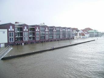 Keywords: Sturmflut in Bremerhaven An der Geeste.jpg Bei einer Sturmflut am 9 November 2007 überfluteter Bereich an der Geeste in Bremerhaven Die Situation auf dem Bild sieht ernsthafter aus als sie tatsächlich ist Derartige Sturmfluten ereignen sich mehrmals im Herbst/Winter und die Hauseigentümer in diesem Viertel sind darauf vorbereitet Beim Haus links handelt es sich um ein neues Gebäude bei dem der Hochwasserschutz besonders berücksichtigt wurde Floodings caused by a storm tide in Bremerhaven on 9 November 2007 The situation looks more complicated than it really is Such tides happen several times in autumn and winter and house owners are used to handle these situations Own 2007-11-09 Garitzko Storm_tide_in_Bremerhaven Geeste river 2007 in Bremerhaven |