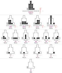 | Keywords: Subgroups of Z2^4; digit weights in equivalence classes.svg v Subgroups of nimber addition Z24 The equivalence classes can be defined by multisets of their positive digit weights <br> They correspond to some integer partitions denoted by their index in A194602 shown in violet <br> Compare right column in this table The higher indices are taken from https //oeis org/A194602/a194602 txt this table where the values are +1 The 1 4 6 4 1 pattern in the vertices is from Pascal's triangle the 1 4 6 4 1 pattern of the whole structure is from A076831 own Mate2code Subgroups of nimber addition Binomial coefficients Integer partitions Cc-zero |