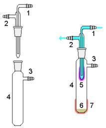 | Keywords: Sublimation apparatus.png 1 Cooling water in 2 Cooling water out 3 Vacuum/gas inlet 4 Sublimation chamber 5 Sublimed compound 6 Crude material 7 Heating Tradução 1 Água refrigerando dentro 2 Água refrigerando para fora 3 Entrada do vácuo/gás 4 Câmara do Sublimation 5 Composto Sublimed 6 Material cru 7 Heating Sublimation apparatus http //en wikipedia org/wiki/Sublimation_ chemistry 11 19 4 November 2006 Quantockgoblin Own work all rights released public domain Laboratory glassware sublimation Condensers chemistry laboratory equipment Laboratory distillation apparatus |