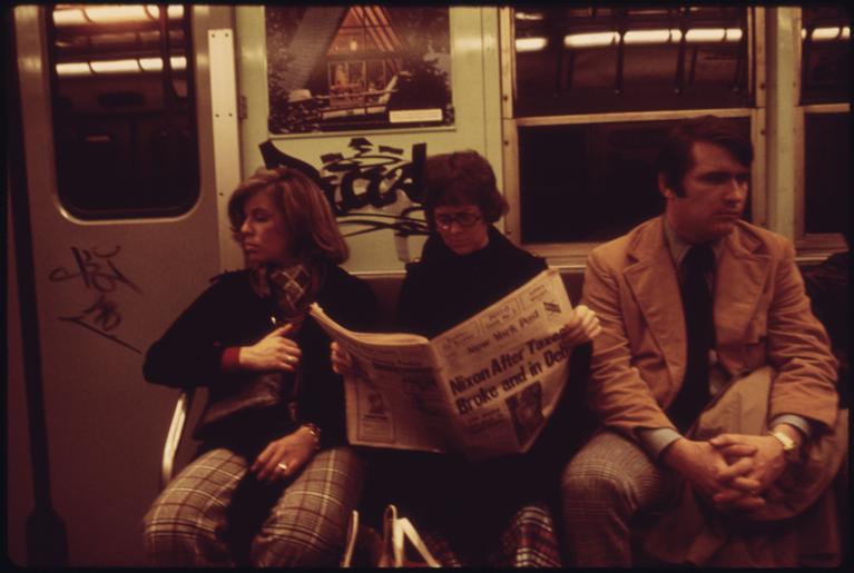 | Keywords: SUBWAY RIDERS LOST IN THEIR OWN THOUGHTS AND READING THE NEWSPAPER ON THE LEXINGTON AVENUE LINE OF THE NEW YORK CITY... - NARA - 556666.tif Scope and content General notes 556666 Local identifier 412-DA-14214 Environmental Protection Agency 12/02/1970 - NARA-Author Pickerell Jim 1936- Photographer 4588217 <br /> New York New York state United States North and Central America inhabited place 4191644 40 7 -74 <br /> Still Picture Records Section Special Media Archives Services Division NWCS-S National Archives at College Park 8601 Adelphi Road College Park MD 20740-6001 04/1974 Record group Record Group 412 Records of the Environmental Protection Agency 1944 - 2006 Record group ARC 708 DOCUMERICA The Environmental Protection Agency's Program to Photographically Document Subjects of Environmental Concern compiled 1972 - 1977 Series ARC 542493 File unit File unit ARC Variant control numbers Agency-Assigned Identifier 237/54/014214<br /> NAIL Control Number NWDNS-412-DA-14214 yes Other versions <gallery> File SUBWAY_RIDERS_LOST_IN_THEIR_OWN_THOUGHTS_AND_READING_THE_NEWSPAPER_ON_THE_LEXINGTON_AVENUE_LINE_OF_THE_NEW_YORK_CITY _-_NARA_-_556666 tif tif File SUBWAY_RIDERS_LOST_IN_THEIR_OWN_THOUGHTS_AND_READING_THE_NEWSPAPER_ON_THE_LEXINGTON_AVENUE_LINE_OF_THE_NEW_YORK_CITY _-_NARA_-_556666 jpg jpg </gallery> NARA-cooperation PD-USGov Newspaper readers New York City Subway car interiors IRT Lexington Avenue Line NARA TIF images with categorized JPGs People on trains |