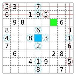 Keywords: Sudoku-scan-and-count.svg This Sudoku graph is modificated from the Cross-hatching svg Cross-hatching svg 50 2012-11-27 21 22 UTC Cross-hatching svg Tim Stellmach derivative work Wikipit sudoku-scan-and-count svg Cross-hatching svg <b>en </b> This modification illustrates two methods for solving not only the cross hatching scan than the counting too I have drawn the graph in Libre Office and exported to svg <b>Content </b> 1 Scan Search for any number e g 5 On the red lines are further 5 forbidden In the upper right block the <i>only free position</i> for the 5 is the green place 2 Count For the blue field check all numbers between 1 and 9 in line and column blue marked The <i>only free number</i> is 5 for this field de Dieses Mustersudoku is eine Abwandlung von Cross-hatching svg Diese Modifikation illustriert zwei Lösungsmethoden nicht nur das Sichten scan wie in Cross-hatching svg sondern auch das Durchzählen Ich habe diese Grafik eigenhändig in Libre Office gezeichnet und dann nach svg exportiert <b>Inhaltserklärung </b> 1 Sichten Nimm eine häufige Ziffer z B 5 Auf den roten Linien Zeilen und Spalte sind weitere 5 verboten Die <i>einzige freie Position</i> im oberen rechten Block für eine 5 ist somit das grün markierte Feld 2 Durchzählen von Kandidaten Für das blau markierte Feld in der Mitte scheiden alle bereits vorgegebenen Ziffern in der Zeile und Spalte aus alle blau eingerahmt Die <i>einzige verbliebene Zahl</i> ist 5 sie ist für dieses Feld die Lösung Sudoku