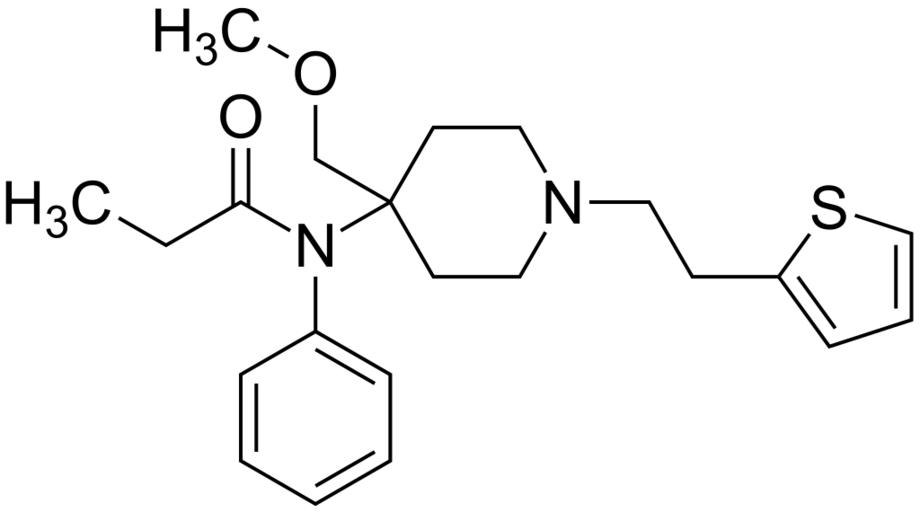 Keywords: Sufentanil 200.svg validSVG Structure of N- 4- methoxymethyl -1- 2- thiophen-2-yl ethyl piperidin-4-yl -N-phenylpropionamide Own 2014-04-17 Emeldir <span class signature-talk >talk</span> Chemical structure verified https //upload wikimedia org/wikipedia/commons/d/d0/Sufentanil_200 svg 1S/C22H30N2O2S/c1-3-21 25 24 19-8-5-4-6-9-19 22 18-26-2 12-15-23 16-13-22 14-11-20-10-7-17-27-20/h4-10 17H 3 11-16 18H2 1-2H3 GGCSSNBKKAUURC-UHFFFAOYSA-N 56030-54-7 Synonyms <small>N- 4- Methoxymethyl -1-2- 2-thienyl ethyl-4-piperidyl propionanilide N- 4- Methoxymethyl -1-2- 2-thienyl ethyl-4-piperidyl propionanilide citrate Chronogesic DEA No 9740 HSDB 6760 N-2- 2-thienyl ethyl-4-piperidinyl-N-phenylpropanamide N-2- 2-thienyl ethyl-4-piperidinylpropionalnalide N-2- 2-thienyl ethyl-4-piperidylpropionanilide R-30730 R-33800 Sufenta Sufentaniili Sufentaniilisitraatti Sufentanil Sufentanil Citrate Sufentanil citrát Sufentanil Sitrat Sufentanil citrate de Sufentanili Citras Sufentanilio citratas Sufentanilis Sufentanilo Sufentanilo citrato de Sufentanilum Sufentanyl Szufentanil Szufentanil-citrát</small> PD-chem Sufentanil