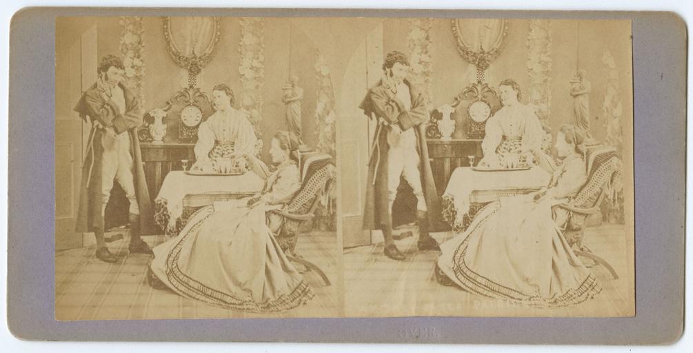 Keywords: stereographs tea sugar parlors genre stereographs genrestereographs sketch drawing photo border illustration Genre stereograph showing two women and a man having tea in a parlor. One woman sits in a chair in front of the tea service, her hand hovering above a sugar pot. The other, younger woman stands behind the table, looking toward the handsome young man who faces them. Accession number: P.2011.47.1521a Genre stereograph showing two women and a man having tea in a parlor. One woman sits in a chair in front of the tea service, her hand hovering above a sugar pot. The other, younger woman stands behind the table, looking toward the handsome young man who faces them. Accession number: P.2011.47.1521a