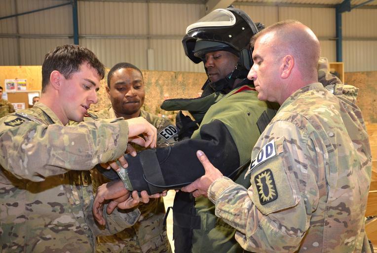 | Keywords: Suiting up the CSM 131124-D-ZQ898-173.jpg  en Staff Sgt Joshua Tygret Sgt 1st Class Henry St Charles and Master Sgt Mark West help 101st Airborne Division Command Sgt Maj Alonzo Smith don the 80-pound bomb suit used by explosive ordnance disposal technicians during a visit with members of Combined Joint Task Force Paladin at Bagram Air Field Afghanistan Nov 24 CJTF Paladin has responsibility for the majority of EOD assets in Afghanistan and conducts counter improvised explosive device training for U S coalition and Afghan forces 2013-11-24 Ed Drohan https //www dvidshub net/image/1059682 131124-D-ZQ898-173 2013-11-24 08 31 BAGRAM AIR FIELD AF PD-USGov Bagram Air Base 101st Airborne Division Combined Joint Task Force Paladin Images from DoD uploaded by Fæ |