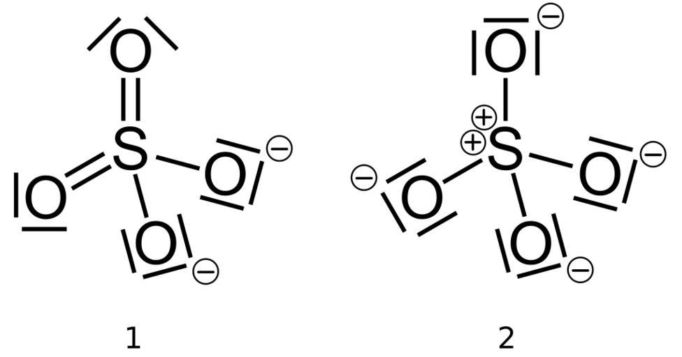 Keywords: Sulfate covalent-ionic.svg en Two representations of the sulfate ion <br />1 with polar covalent bonds only 2 with an ionic bond own Wickey-nl 2011-01-30 Sulfate ion