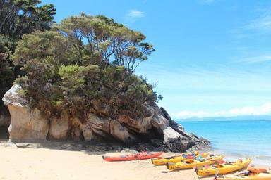 Keywords: summer beach stone trees azure blue sea kayak sand new zealand