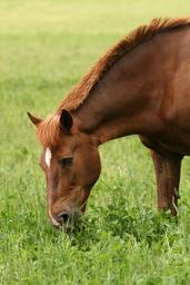 Keywords: summer brown horse eating hay pasture horse head