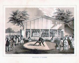 Keywords: Sumo at Yokuhama 1840.jpg Wrestlers at Yokuhama Lithograph Heine printed by Sarony New York 1840s PD-Art Sumo in art Lithographs Artworks missing infobox template