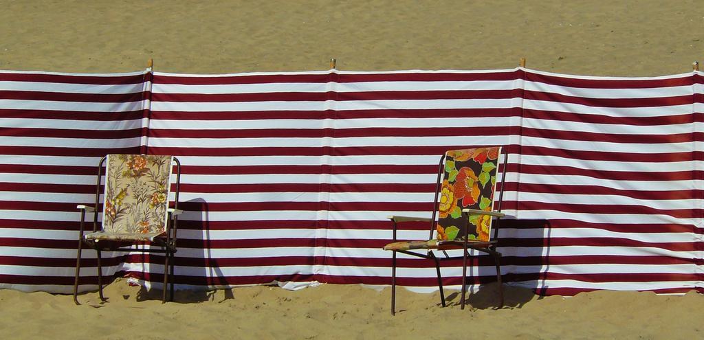 Keywords: sun chair deck chair chair chairs folding chair seat wind protection beach sand beach holiday holidays travel coast sunlight stripes horizontal stripes still life lonely empty sand rest relax sit click transportable old