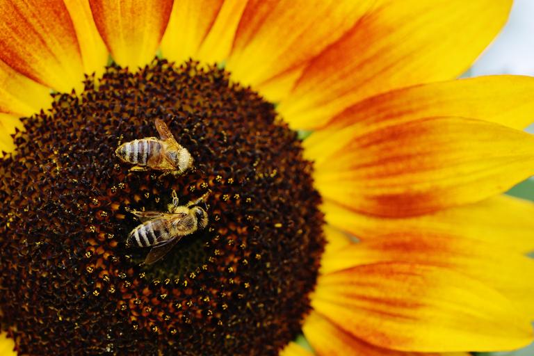 Keywords: sun flower bees summer garden blossom bloom yellow insect helianthus nature pollination close pollen macro sunny sun plant helianthus annuus flower seeds