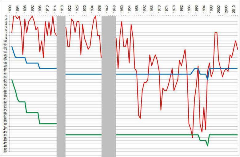 Keywords: Sunderland AFC League positions.jpg Sunderland For some reason the original file vanished League positions since 1890 “91 season Coloured horizontal lines indicate league divisions Blue and green lines represent the divide between first and second divisions and divides between second and third divisions respectively Own <font color 660000>garden</font> newer version thanks to User Izno 2008-09 sport All information for league finishes sourced from http //www catstattery co uk individual season pages Values for number of teams in different tiers researched manually using seceral sources wikitable <hiddentext>generated with de Wikipedia Helferlein/VBA-Macro for EXCEL tableconversion V1 7<\hiddentext> - Season League finish Finishing position Cumultive 1 Cumultive 2 Teams in tier 1 Teams in tier 2 Teams in tier 3 Teams in tier 4 - 1890-91 7 7 12 24 12 12 - 1891-92 1 1 14 26 14 12 - 1892-93 1 1 16 28 16 12 - 1893-94 2 2 16 31 16 15 - 1894-95 1 1 16 32 16 16 - 1895-96 5 5 16 32 16 16 - 1896-97 15 15 16 32 16 16 - 1897-98 2 2 16 32 16 16 - 1898-99 7 7 18 36 18 18 - 1899-1900 3 3 18 36 18 18 - 1900-01 2 2 18 36 18 18 - 1901-02 1 1 18 36 18 18 - 1902-03 3 3 18 36 18 18 - 1903-04 6 6 18 36 18 18 - 1904-05 5 5 18 36 18 18 - 1905-06 14 14 20 40 20 20 - 1906-07 10 10 20 40 20 20 - 1907-08 16 16 20 40 20 20 - 1908-09 3 3 20 40 20 20 - 1909-10 8 8 20 40 20 20 - 1910-11 3 3 20 40 20 20 - 1911-12 8 8 20 40 20 20 - 1912-13 1 1 20 40 20 20 - 1913-14 7 7 20 40 20 20 - 1914-15 8 8 20 40 20 20 - 1915-16 - 1916-17 - 1917-18 - 1918-19 - 1919-20 5 5 22 44 22 22 22 - 1920-21 12 12 22 44 22 22 42 - 1921-22 12 12 22 44 22 22 42 - 1922-23 2 2 22 44 22 22 42 - 1923-24 3 3 22 44 22 22 44 - 1924-25 7 7 22 44 22 22 44 - 1925-26 3 3 22 44 22 22 44 - 1926-27 3 3 22 44 22 22 44 - 1927-28 15 15 22 44 22 22 44 - 1928-29 4 4 22 44 22 22 44 - 1929-30 9 9 22 44 22 22 44 - 1930-31 11 11 22 44 22 22 44 - 1931-32 13 13 22 44 22 22 43 - 1932-33 12 12 22 44 22 22 44 - 1933-34 6 6 22 44 22 22 44 - 1934-35 2 2 22 44 22 22 44 - 1935-36 1 1 22 44 22 22 44 - 1936-37 8 8 22 44 22 22 44 - 1937-38 8 8 22 44 22 22 44 - 1938-39 16 16 22 44 22 22 44 - 1939-40 - 1940-41 - 1941-42 - 1942-43 - 1943-44 - 1944-45 - 1945-46 - 1946-47 9 9 22 44 22 22 44 - 1947-48 20 20 22 44 22 22 44 - 1948-49 8 8 22 44 22 22 44 - 1949-50 3 3 22 44 22 22 44 - 1950-51 12 12 22 44 22 22 48 - 1951-52 12 12 22 44 22 22 48 - 1952-53 9 9 22 44 22 22 48 - 1953-54 18 18 22 44 22 22 48 - 1954-55 4 4 22 44 22 22 48 - 1955-56 9 9 22 44 22 22 48 - 1956-57 20 20 22 44 22 22 48 - 1957-58 21 21 22 44 22 22 48 - 1958-59 15 37 22 44 22 22 24 24 - 1959-60 16 38 22 44 22 22 24 24 - 1960-61 6 28 22 44 22 22 24 24 - 1961-62 3 25 22 44 22 22 24 23 - 1962-63 3 25 22 44 22 22 24 24 - 1963-64 2 24 22 44 22 22 24 24 - 1964-65 15 15 22 44 22 22 24 24 - 1965-66 19 19 22 44 22 22 24 24 - 1966-67 17 17 22 44 22 22 24 24 - 1967-68 15 15 22 44 22 22 24 24 - 1968-69 17 17 22 44 22 22 24 24 - 1969-70 21 21 22 44 22 22 24 24 - 1970-71 13 35 22 44 22 22 24 24 - 1971-72 5 27 22 44 22 22 24 24 - 1972-73 6 28 22 44 22 22 24 24 - 1973-74 6 28 22 44 22 22 24 24 - 1974-75 4 26 22 44 22 22 24 24 - 1975-76 1 23 22 44 22 22 24 24 - 1976-77 20 20 22 44 22 22 24 24 - 1977-78 6 28 22 44 22 22 24 24 - 1978-79 4 26 22 44 22 22 24 24 - 1979-80 2 24 22 44 22 22 24 24 - 1980-81 17 17 22 44 22 22 24 24 - 1981-82 19 19 22 44 22 22 24 24 - 1982-83 16 16 22 44 22 22 24 24 - 1983-84 13 13 22 44 22 22 24 24 - 1984-85 21 21 22 44 22 v 22 24 24 - 1985-86 18 40 22 44 22 22 24 24 - 1986-87 20 42 22 44 22 22 24 24 - 1987-88 1 45 21 44 21 23 24 24 - 1988-89 11 31 20 44 20 24 24 24 - 1989-90 6 26 20 44 20 24 24 24 - 1990-91 19 19 20 44 20 24 24 24 - 1991-92 18 40 22 46 22 24 24 22 - 1992-93 21 43 22 46 22 24 24 22 - 1993-94 12 34 22 46 22 24 24 22 - 1994-95 20 42 22 46 22 24 24 22 - 1995-96 1 21 20 v 44 20 24 24 24 - 1996-97 18 18 20 44 20 24 24 24 - 1997-98 3 23 20 44 20 24 24 24 - 1998-99 1 21 20 44 20 24 24 24 - 1999-2000 7 7 20 44 20 24 24 24 - 2000-01 7 7 20 44 20 24 24 24 - 2001-02 17 17 20 44 20 24 24 24 - 2002-03 20 20 20 44 20 24 24 24 - 2003-04 3 23 20 44 20 24 24 24 - 2004-05 1 21 20 44 20 24 24 24 - 2005-06 20 20 20 44 20 24 24 24 - 2006-07 1 21 20 44 20 24 24 24 - 2007-08 15 15 20 44 20 24 24 24 - 2008-09 16 16 20 44 20 24 24 24 - 2009-10 13 13 20 44 20 24 24 24 - 2010-11 10 10 20 44 20 24 24 24 - 2011-12 13 13 20 44 20 24 24 24 Association football diagrams of England Sunderland AFC |