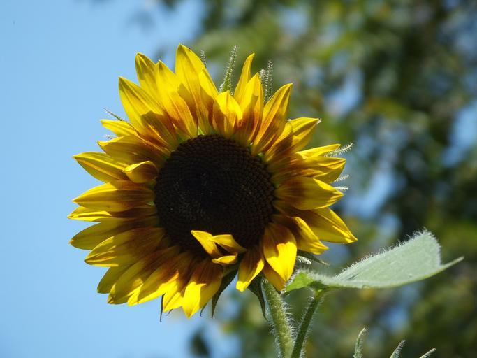 Keywords: sunflower flower sky yellow leaves blue sky petals sunny summer green floral nature garden sunflowers flowers bloom blossom