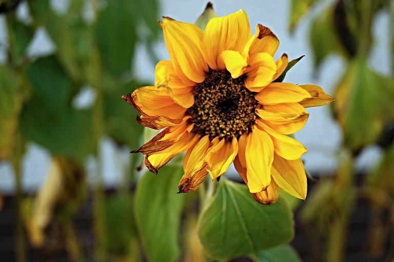 Keywords: sunflower flower yellow damaged by frost foliage